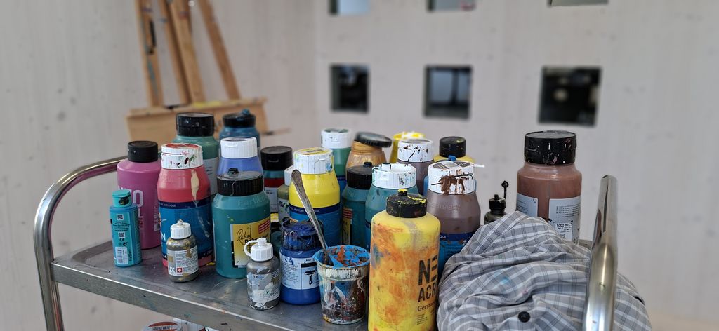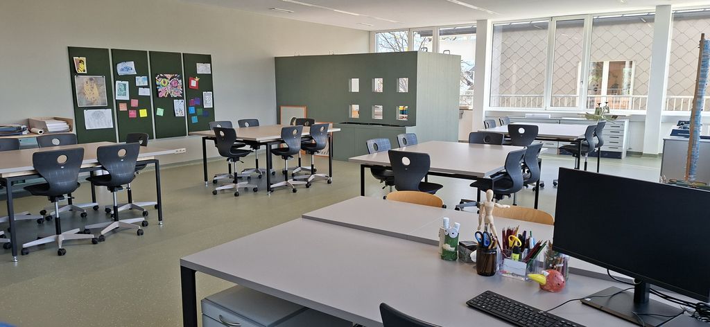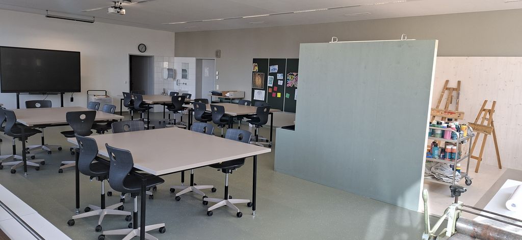 Ein besonderes Highlight des neuen Raumes ist die große Malbox nach dem Vorbild von Arno Stern. In ihrem Inneren sollen die Schüler:innen künftig frei malen und ihrer Kreativität freien Lauf lassen. Noch strahlt die Box in Weiß – doch das wird sich sicher bald in ein buntes Farbenspiel verwandeln!